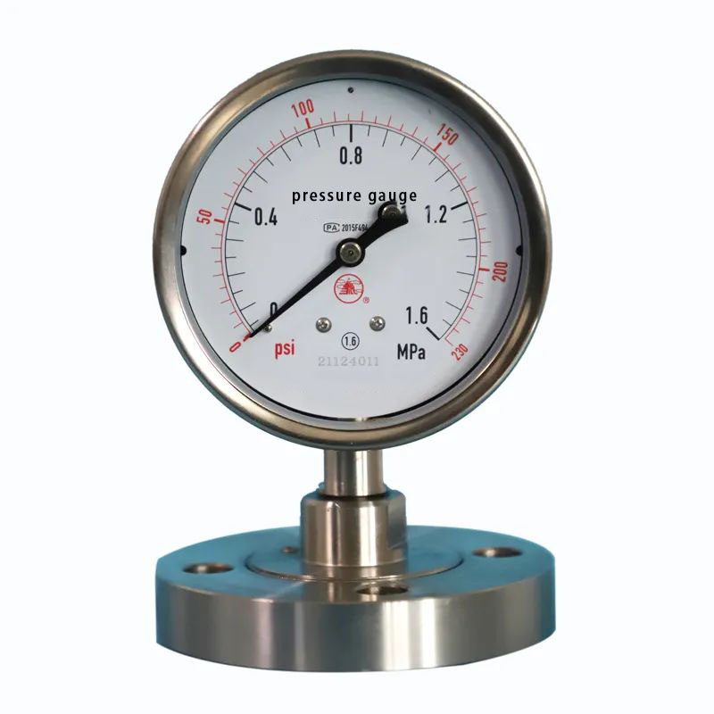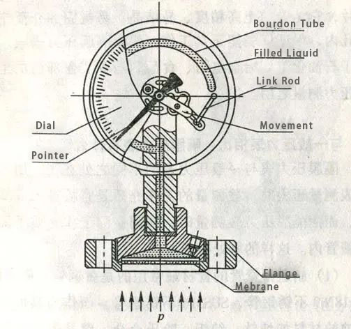 Когда давление давления диафрагмы измеряет давление, измеренная рабочая среда непосредственно действует на диафрагму изоляции. Диафрагма подвергается деформации вверх. Среднее давление передается в пружинную трубку через наполнительную жидкость внутри пружинной трубки, что приводит к тому, что конец пружинной трубки подвергается упругим деформации. С помощью механизма сцепления вал передача механизма приводит к вращению, что приводит к тому, что указатель указывает на измеренное значение давления на шкале.