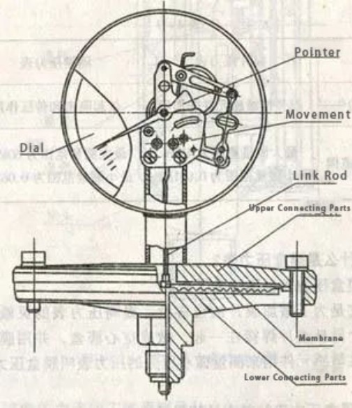 Под влиянием давления измеренная рабочая среда непосредственно действует на упругую диафрагму. Диафрагма подвергается упругой деформации вверх (для измерения положительного давления) или вниз (для измерения отрицательного давления). Через механизм соединительного стержня, закрепленного в центре диафрагмы, он приводит к вращению механизма с валом передачи механизма, что приводит к тому, что указатель указывает на измеренное значение давления по шкале.